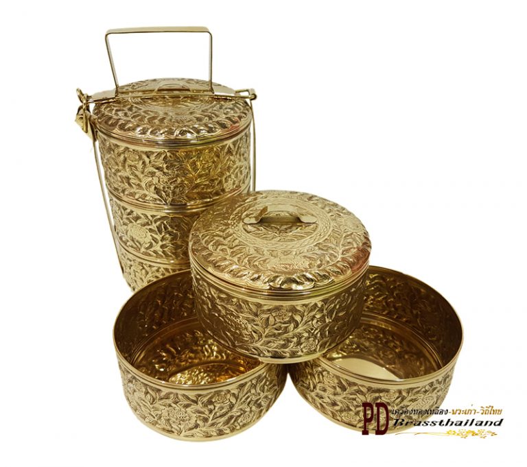 ปิ่นโตทองเหลืองตอกลาย 3 ชั้น ชุดปิ่นโตทำมาจากเนื้อทองเหลืองอย่างดี งานแกะสลักลายและตอกลวดลายดอกมะลิไทยงดงามมาก ปิ่นโตทองเหลืองตอกลายเป็นภาชนะใส่อาหารคาวหวานมาตั้งแต่เรายังเด็กมีให้ใช้งานกันอย่างแพร่หลาย ลวดลายมากมาย วันนี้เราขอนำเสนอปิ่นโตทองเหลืองตอกลวดลายอย่างดี มีความแข็งแรง ทนทาน ทำความสะอาดได้ง่าย เก็บรักษาได้อย่างยาวนานในราคาพิเศษสุดคุ้ม หรือ เลือกซื้อปิ่นโตทองเหลืองเป็นของขวัญของกำนัลของแต่งบ้าน โรงแรม รีสอร์ท ร้านอาหาร ห้องแสดงสินค้า ฯลฯ