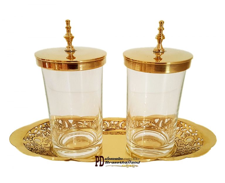 แก้วน้ำถาดฉลุลายไทยพร้อมฝาปิดอย่างดี สวยงาม วางอย่างง่ายๆ ตัวถาดทองเหลืองฉลุลายทายปราณีตทรงคุณค่าแบบวิถีไทย