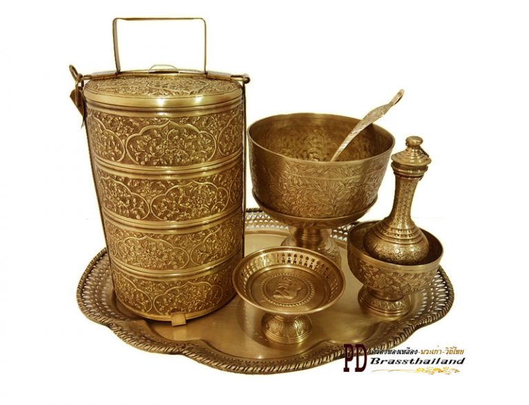 ชุดทำบุญทองเหลือง Set 1. (Make merit Set 1) เนื้อทองเหลืองสีสวยทองสุกได้คุณภาพ งานทองเหลืองตอกลายงามวิจิตรด้วยลวดลายที่สลักขึ้นมาเป็นแบบลายดอกมะลิไทย ชุดทำบุญทองเหลืองอย่างดีได้รับความนิยมนำมาใช้ในงานพิธีต่างๆ อาทิเช่น ตักบาตร ถวายอาหารที่วัด งานพิธีสำคัญๆ ชุดงานบุญทองเหลืองมีความหนาได้มาตรฐาน อุปกรณ์ครบครันอย่างดีในชุดตักบาตรทองเหลืองนั้นประกอบไปด้วยอุปกรณ์ดังนี้
